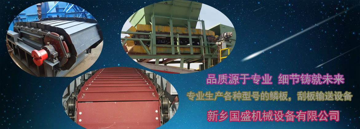 板式给料机在工作时传动装置的电动机经过减速机、联轴器的带动,使主驱动轴旋转,重叠的输送机鳞板固定在两边的链条上,两个主动链轮带动两边链条,鳞板上的托轮通过机架上的导轨导向,通过链条的传动将鳞板上的物料输送到卸料处。