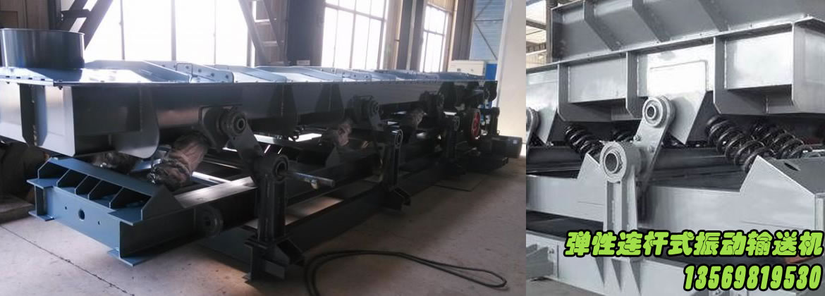 弹性连杆输送机的驱动连杆机构由电动机,皮带轮、传动轴、偏心连杆装置组成。输送槽与底架之间用螺旋弹簧联接,该弹簧是主振弹簧,导向杆起输送槽振动导向作用,输送机运行中驱动机构使连杆端部作往复运动,而连杆通过其端部的螺旋弹簧带动输送槽作往复运动,使物料沿振动方向被连续抛起向前跳跃,达到输送物料的目的。